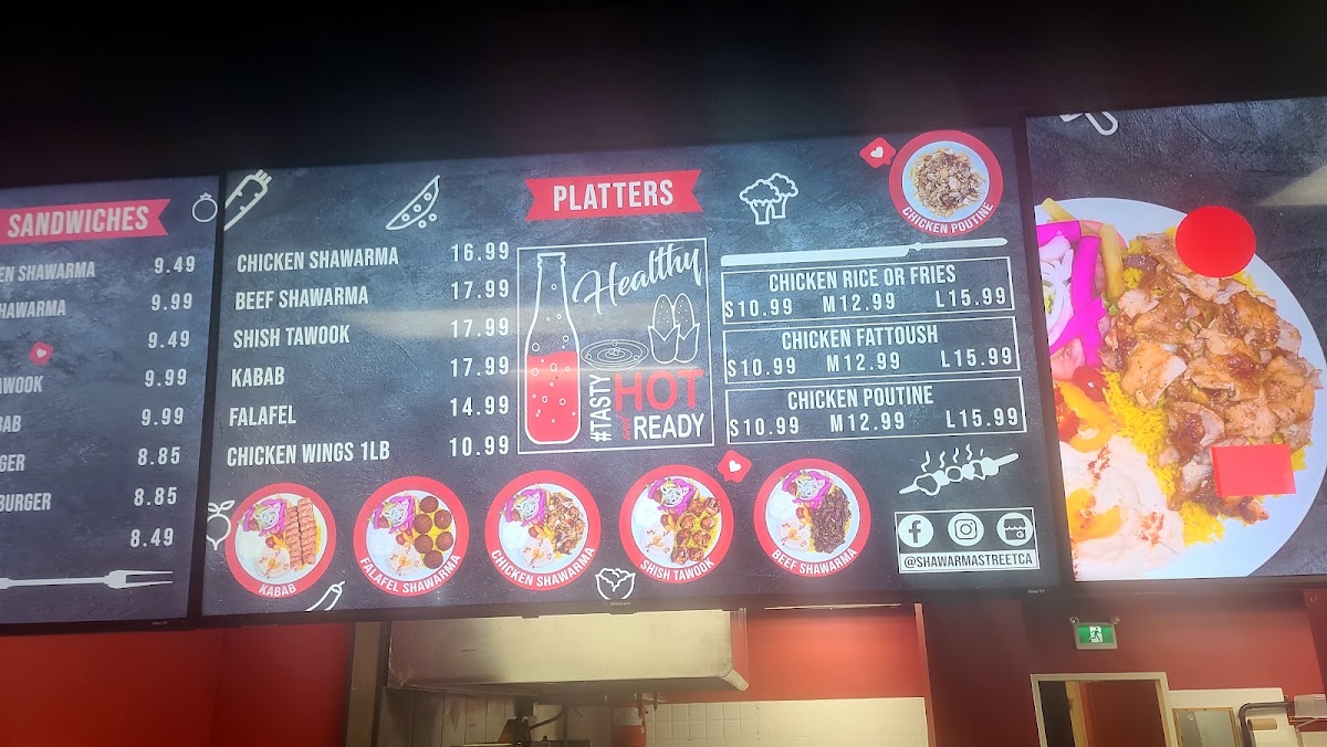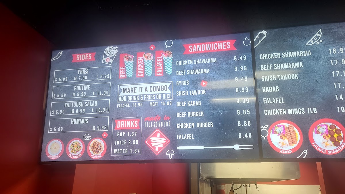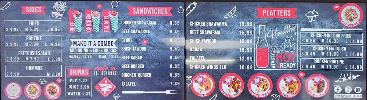 The menu at Shawarma Street offers a straightforward and inviting selection focused on classic shawarma dishes and complementary sides, perfect for a casual and satisfying meal. Guests can expect familiar staples like falafel, chicken shawarma served over rice or fries, and a variety of wrap combos that include fresh ingredients and well-balanced flavors.